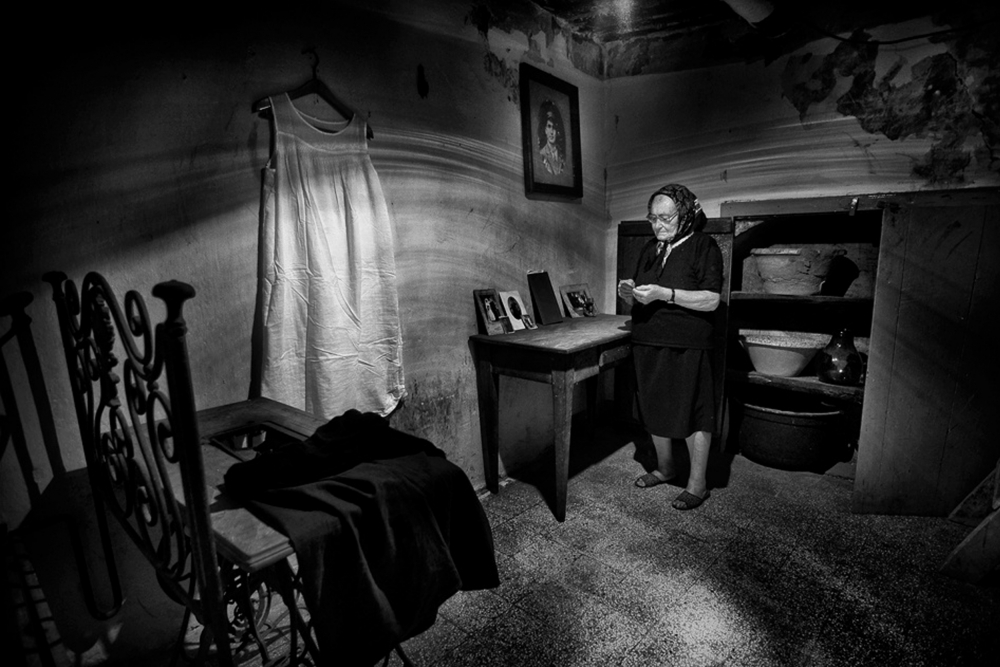 I asked the lady 'Elisabetta' to pose for me, looking at one of the old photos on the table, and she was happy to be photographed. I made a sequence of three hand held shots, what I usually do for this kind of 'in-the-moment' captures. I only used ambient light (no flash) to have a more natural light environment.