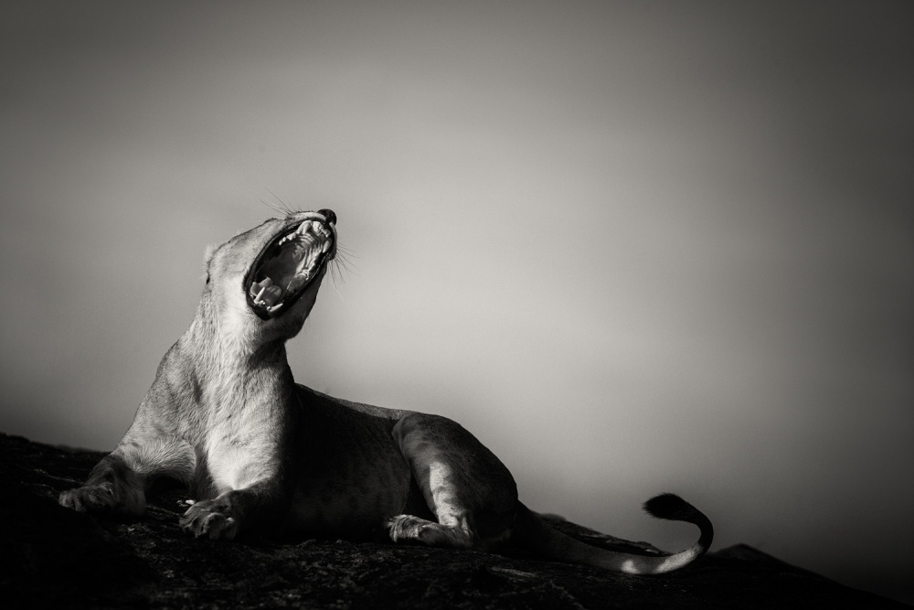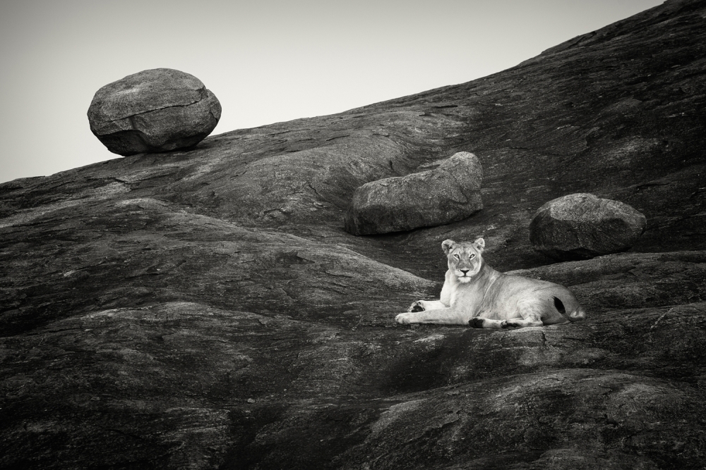 But before I travel to Africa. I try to visualize the trip and the potential photographic scenarios that might occur. Where do I want to position myself if I see a lion standing on a rock in front of me? What distance do I want to shoot from? What lens would I use? Do I want the lion back lit or lit from the side? I try to have a concept, as clear as possible, on how I want the image to look like and what I might actually  encounter. Then I try to meet somewhere in the middle. And in most cases it works. When I photographed ”Lioness on the rocks” in the Serengeti in Tanzania,my concept was to photograph a lion on the rocky hillsides and I especially wanted a photograph including the unusual round rocks that are common in the Serengeti to be dominant in the image. I was driving around in circles around the rocky areas looking for opportunities. When I found the lioness on the rock I recognized the opportunity and took the shot. She got up, looked at me, I photographed 2-3 more shots and she walked away. The entire session lasted maybe 5-10 seconds.