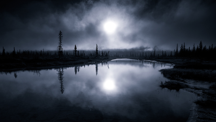 In one of the photos featured here, ‘Neverland’, I wanted to convey a dark sinister mood. The spectral shaped cloud appears to be rising up from the lake. I had originally shot this with a more extensive foreground but eventually decided that grounding the viewer took away some of that mystery. I worked on the contrast in the lake instead to bring up the vague reflections of the cloud instead and cropped off the bottom half of the original image.
