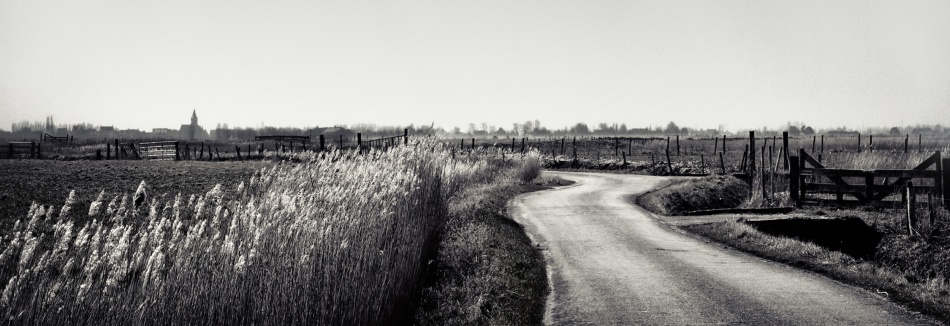 Most details are to be found in Piet's friendly evocation of the Flemish polder - the typical church spire, the village and farms at the horizon, the reeds edging the ditches waving gently in the ever-present wind. The only detail in Jacob’s photo is the struggling cyclist, who has to battle the stark weather, the wind, the rain, the cold in this menacing, bleak landscape.