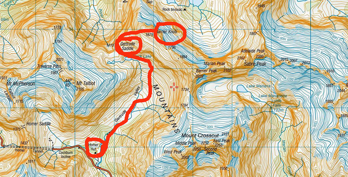 Our original plan was to start from Homer Hut near the Homer Tunnel entrance on the way to Milford Sound, climb to Gertrude Saddle, camp there for one night, and then climb to Barrier Knob Barrier Peak Col on the second day, stay there for another two nights; finally return to Homer Hut on the fourth day. Our climbing route is described in the following map.