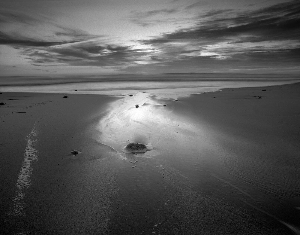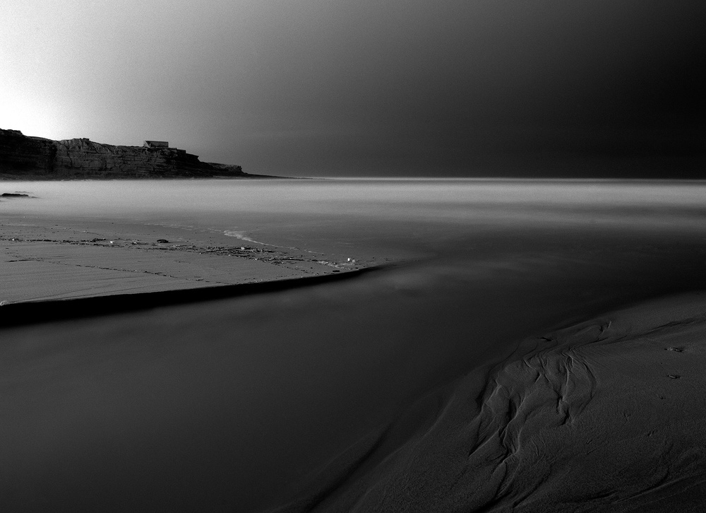 I shoot, mainly, Landscape, Studio Portrait, Nude and Urban Photography. Each one of these kinds of photography have a different approach. I will describe a Landscape session, which is the most complex. First, I decide where I'm going to do the session. Let's assume I will be shooting by the sea, (I live 4 kilometres from the sea, which is pretty simple. First of all, I look at the tide schedule to be aware of the best day to shoot. I like wide tides and usually, I prefer the very low tide, about 15 minutes before sunrise, during autumn, winter or spring, because there is no people on the beach and if the high tide has been very high, the most part of the sand will not have any footprints. For those sessions, I always carry a lightweight but warm jacket, fisherman gloves, fisherman waterproof boots, a warm hat, sunglasses, cleaning tissues for the lenses and filters, red, orange, green, yellow, polarizer filters, tripod, spotmeter, my little black book, where I have several reciprocity failure charts of the films I use, as well as some of my own charts that I make when I start to use film. Tripod is a must, as well as shutter cable release and a few other stuff (a lot of it). When I arrive at the spot, I start to look for the best angle and I start to “imagine” the final image.  Regarding the contrast I want, I choose the filters I will need to achieve the image. Next, I measure light with the spotmeter and see what's the best aperture/shutter speed for the image I want, regarding the depth of field, water movement, contrast, etc. Sometimes, I shoot in a way that is the best compromise, knowing that I will need to compensate some highlights in the film developing or in the enlarger (dodge, burn, etc) or even both, this happens often, because I like to shoot in low light conditions.