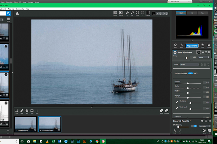 Most of the time, I use the Topaz Impresion suite.  It has some awesome creative filters.  I didn't want to use any filter with an “agressive” or “overdone” look not to change the appearance of the image.  So thinking about a “soft” filter called “pencil”. This filter gives the photo a slight pen sketch look.  Adjusting the values, the filter even made the background fading to really have the feeling of a ship drifting alone on the sea.