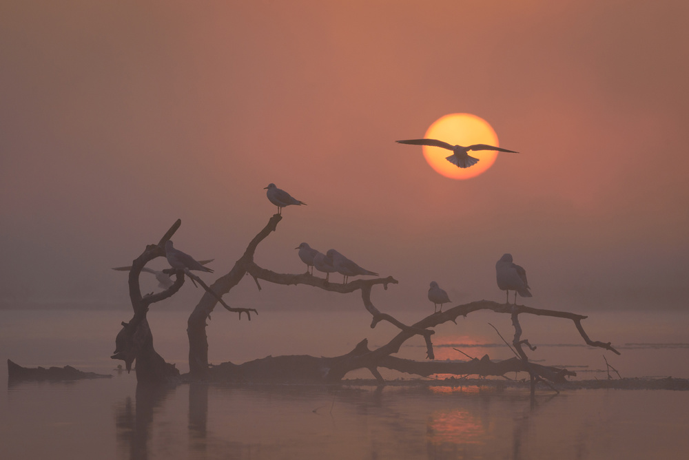 The image was taken in Danube's Delta, at sunrise. While the mist was scattering we were able to see a branch with some gulls resting on it. At some point another ones arrived at the place, flying, so I've waited for the moment when one of them was on the sun direction.