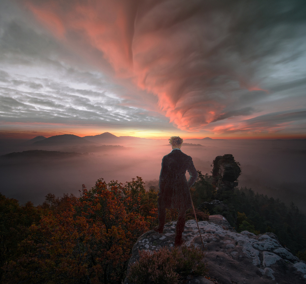 In later work he used the device of Ruckenfigur – a person seen from behind contemplating the view, giving the impression that the human is diminished in the face of the expansiveness of nature, and forcing the viewer to draw his own conclusions as to the thoughts of the figure in the painting.