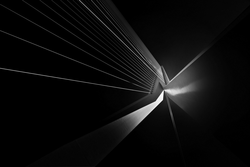 The picture shows one of the most recognizable and photographed bridges in the world — the Erasmusbrug in Rotterdam. It was shot at high noon, in bright sunlight and clear blue sky, creating an intense, flat light. That would have been a problem for the unprocessed picture as such, but it created perfect conditions for further image processing.