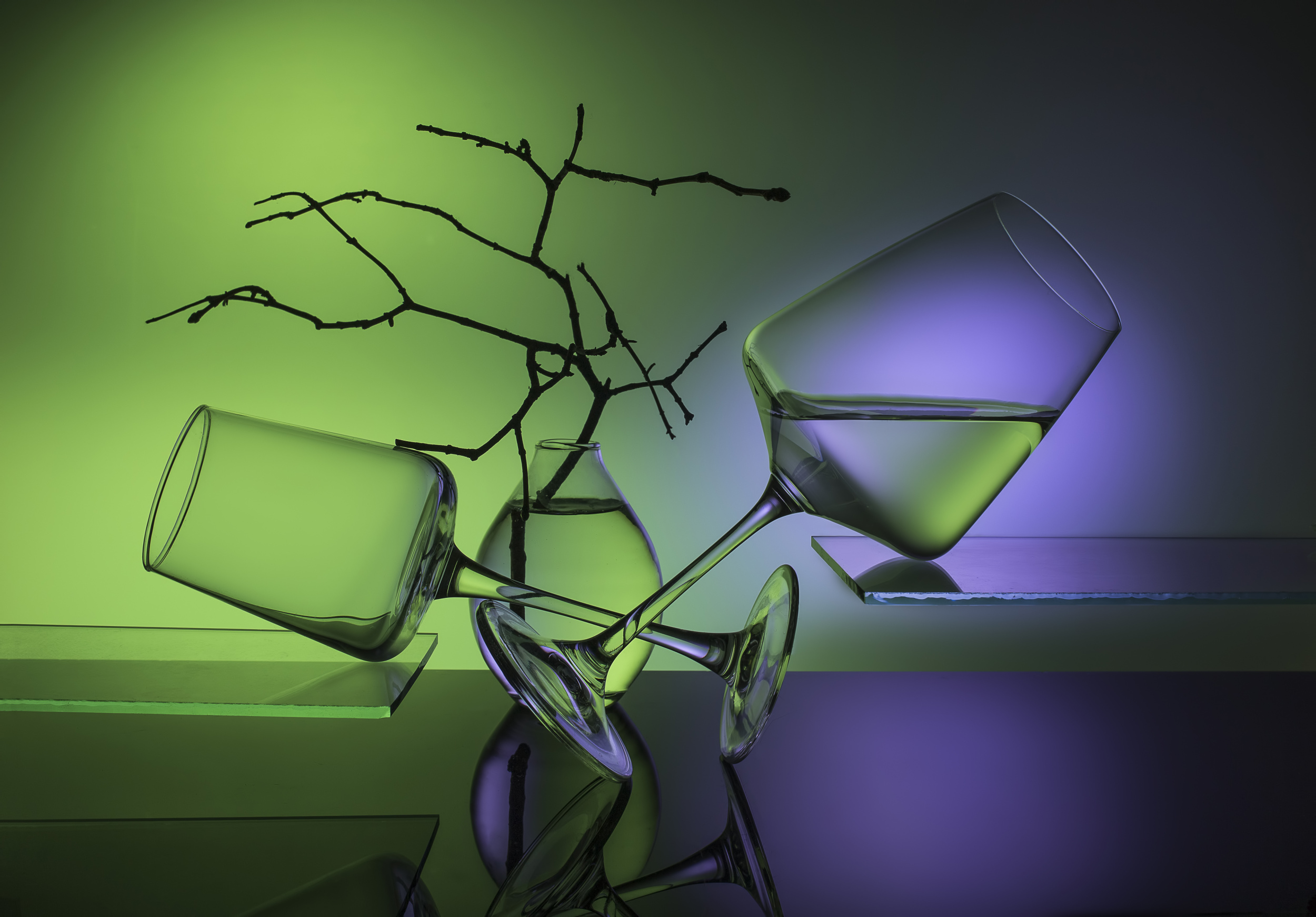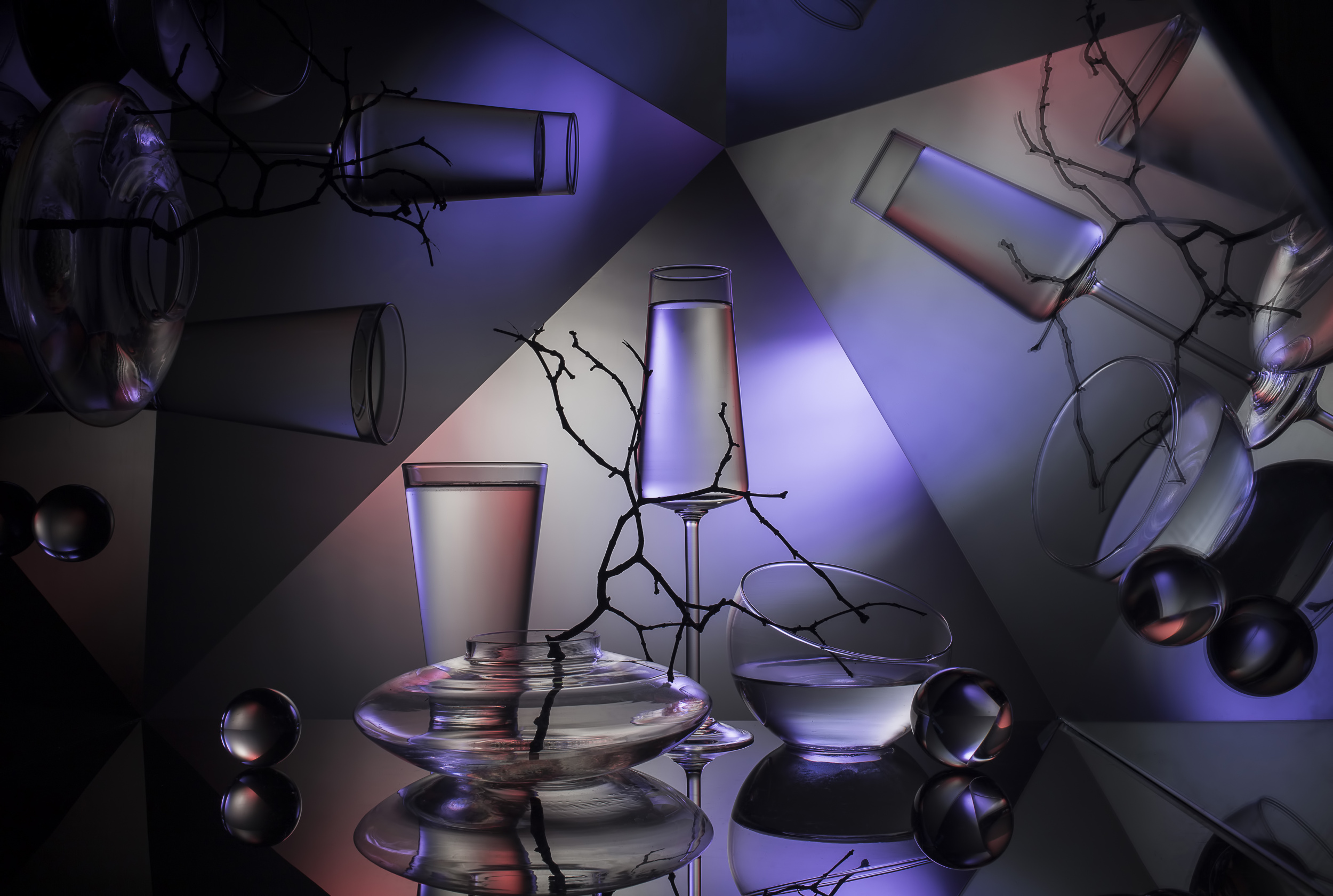Along with technical perfection, I was constantly improving my own style. It was not interesting for me to shoot, like everyone else, jugs and vases with flowers, I wanted to do something unusual. So I have two main directions: compositions made up of glass objects, and compositions of solid opaque objects with complex lighting. I do not seek to have some deep hidden meaning embedded in the composition, it is enough for me to harmoniously arrange my "models" and beautifully illuminate them. I carefully select objects for my works, usually 10-15 variants of the same composition with different objects are obtained, until in the end there is one, the only true, most aesthetic option. So I can say without any doubt, that to me, the technical perfection, the composition and the aesthetics are the most important. However, sometimes I have jobs in which I try to put some feelings.
