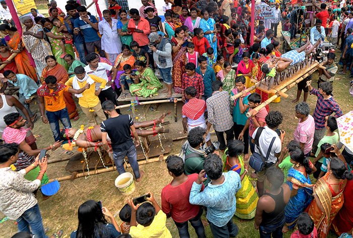 As the cycle vans with ‘crucified’ persons start moving towards another temple, there is a huge commotion as village people run with the procession. The vans and the devotees run in a circle and return back to the Shiva temple. All devotees pray to the Lord Shiva and the ritual is finished.