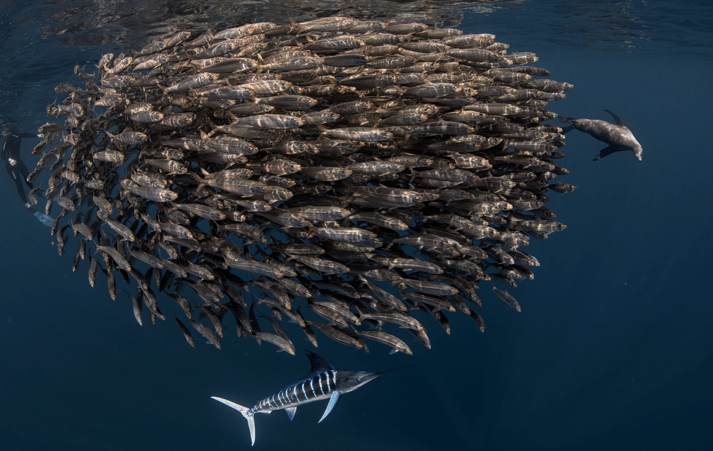 That kind of activity can sometimes be dangerous because the speed of marlin hunting is 60 miles an hour. The bait ball runs towards us when they are hunted because they want us to be their WALL to block their predators. We have to get away from them quickly, but many people have still been hurt by the sharp mouth of marlins. Actually, I myself was twice in danger on that trip. When several predators hunt a ball of bait, they do not fight, but sometimes hunt in turn. When a sea lion, looking at a ball of bait, gets ready to charge, you don’t want to be in their way.