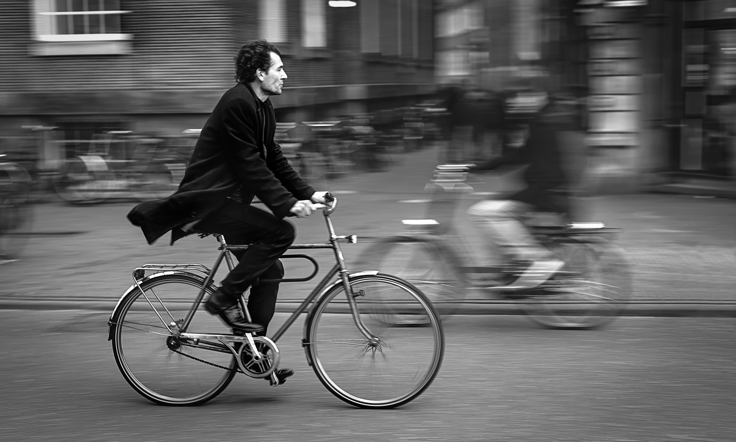 For a normal moving car or motorbike 1/60 sec, and for a cyclist or pedestrian at five to ten metres, 1/25 sec to 1/10 sec or even 0.5 sec are good starting values if you use an 18-55 mm wide-angle or normal lens.