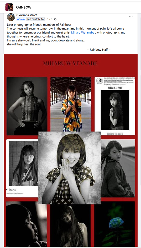 ![]() | Arnon Orbach CREW Terrible sad news, shocked to find out that my dearest Miharu passed away, she had so much more to give us all in her very humanistic and beautiful images all full of love with exceptionally fine observation of nature around us. My sincere condolences to Miharu family. May she rest in peace. I will miss her comforting words and images very much. |