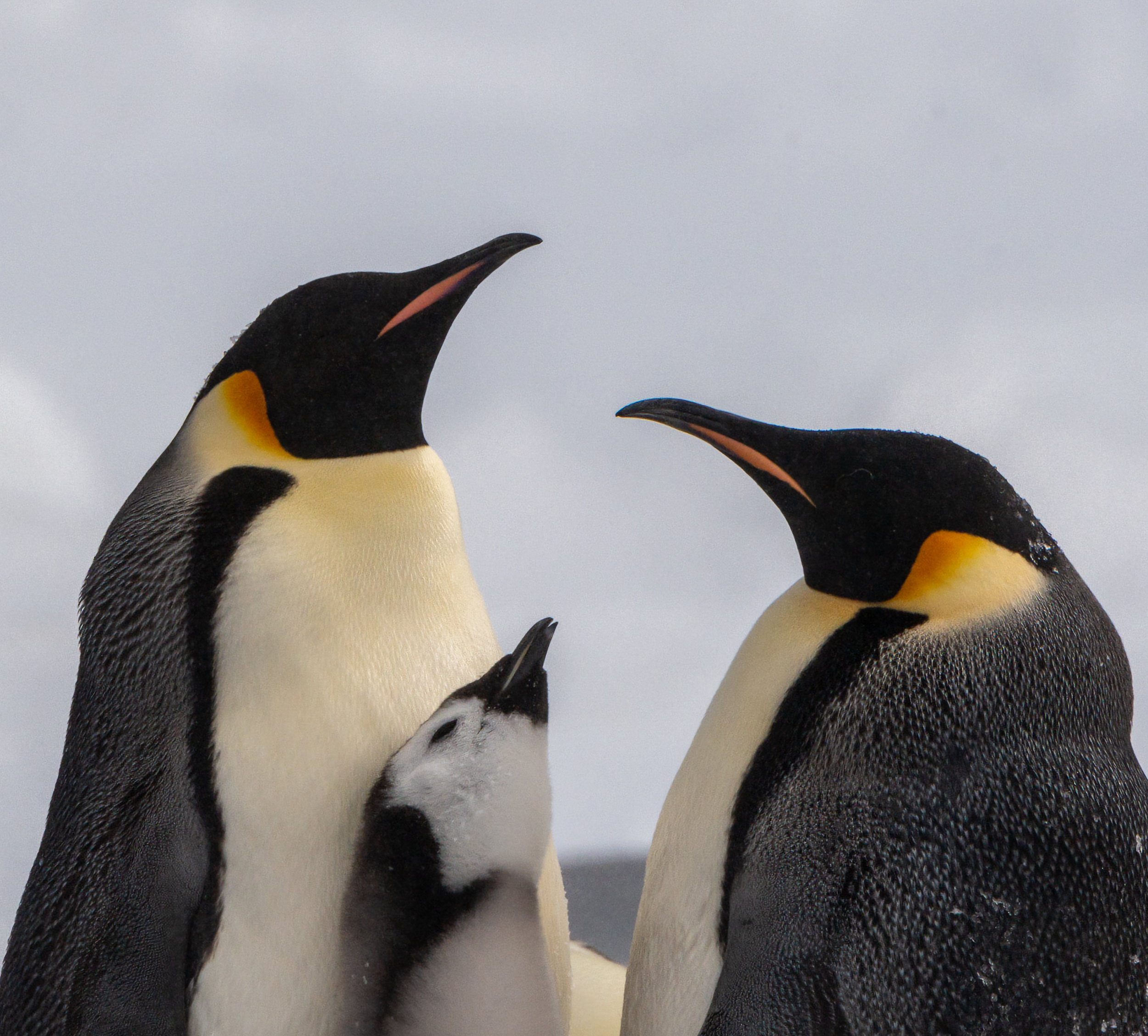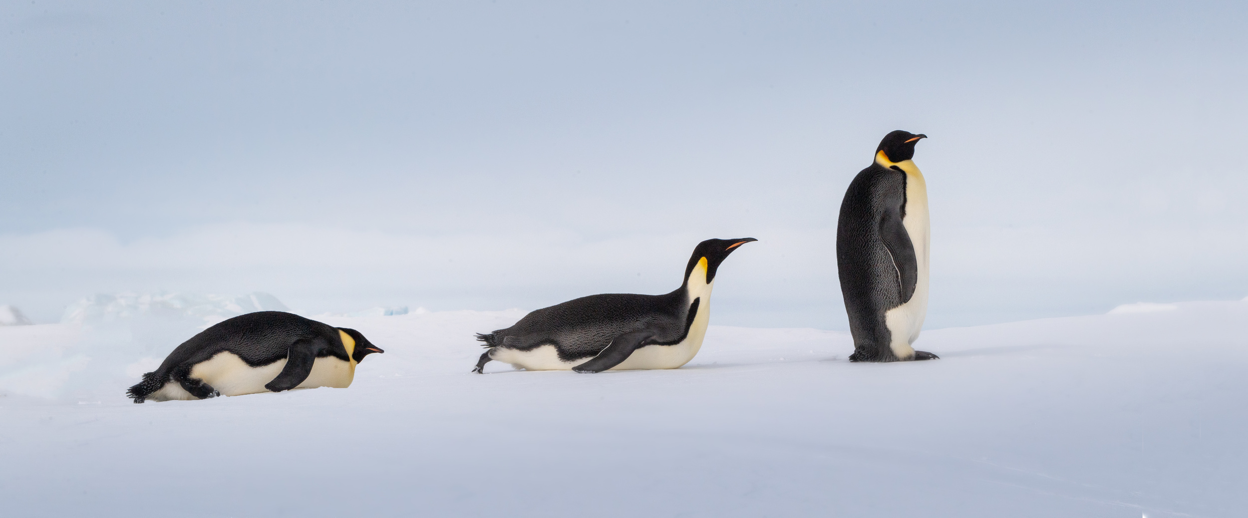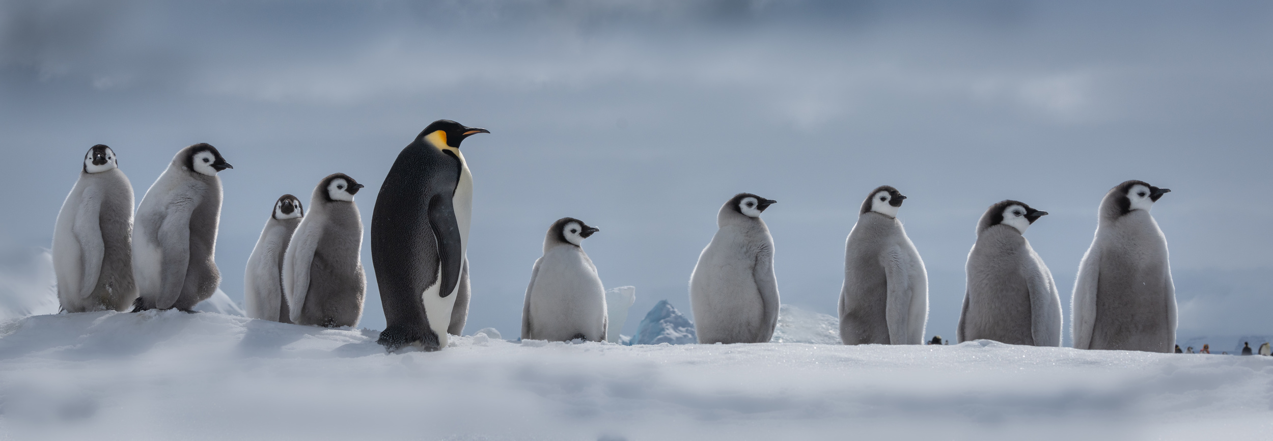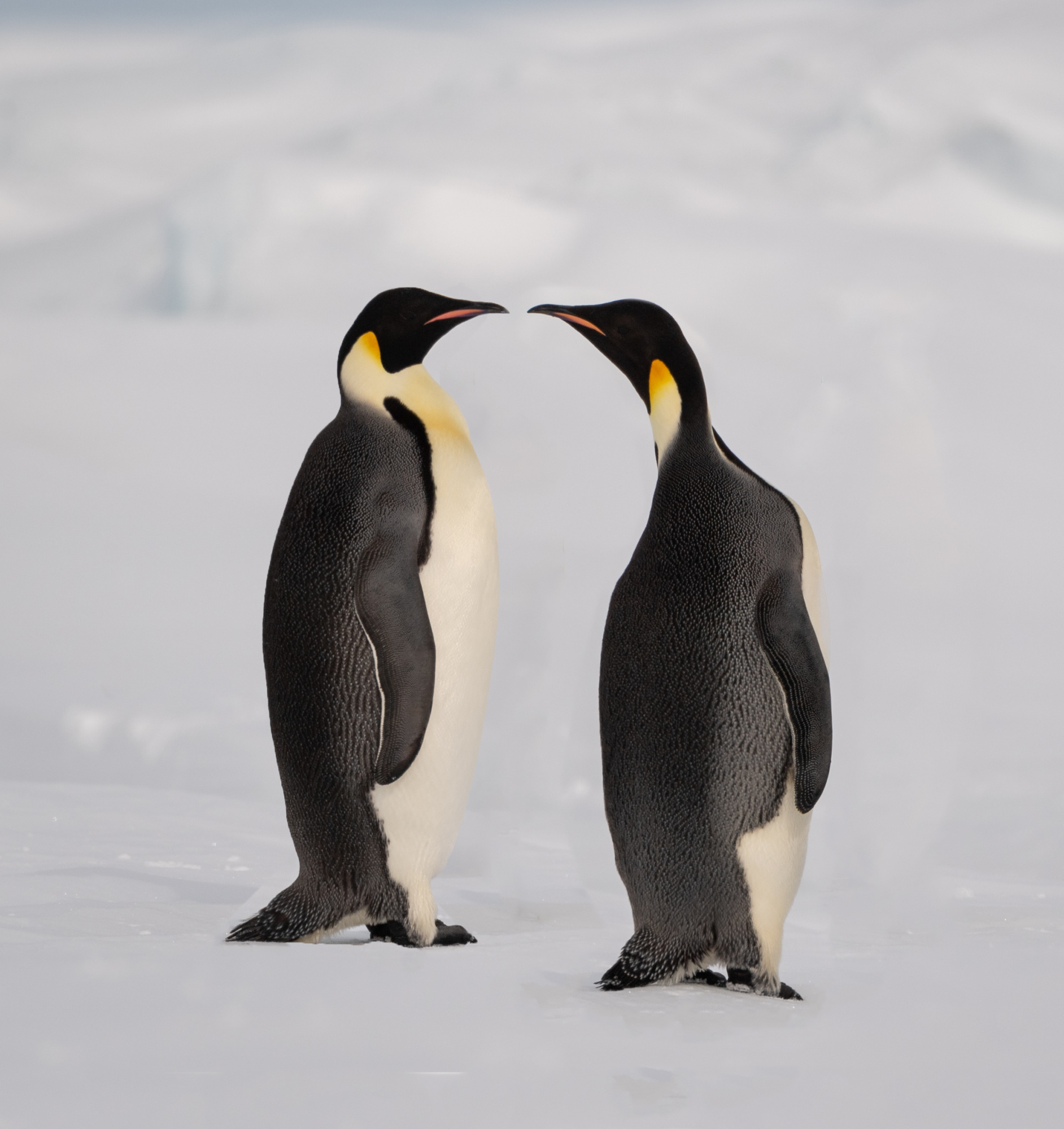 Snow Hill Island is home to up to 10,000 Emperor Penguins, making it the northernmost location on the continent where these penguins can be found. Wild Emperor penguins are only found in Antarctica. They breed and raise their young mostly on ‘fast ice’, a floating platform of frozen ocean which is connected to the land or to ice shelves. From birth, they spend their entire lives in and around the Antarctic ice, although very rarely vagrants have turned up off the coast of New Zealand. Emperors are the biggest of the 18 species of penguin found today, and one of the largest of all birds. They are approximately 120cm tall (about the height of a six year old child) and weigh in at around 40 kg, though their weight does fluctuate dramatically throughout the year. Emperors are the least common Antarctic penguin, with global population estimates of 265,500–278,500 breeding pairs. Emperor penguin colonies have been discovered and counted from space. For the last 15 years, British Antarctic Survey (BAS) scientists have been looking for new colonies by searching satellite imagery for their guano stains on the ice. There are now 66 known emperor penguin colonies around the coastline of Antarctica. Emperors incubate their eggs during the long dark southern winter months. Courtship displays are intricate but copulation is quick and the female lays a single egg in May or June. She then passes it over to her mate to incubate - and she’s off. She spends the next nine weeks at sea, feeding. The male carefully balances the egg on his feet for between 65 – 75 days to keep it warm in a specially adapted brood pouch, and off the snow surface, before it hatches. Emperors are uniquely adapted to survive these harsh conditions when temperatures can drop down to a bone chilling -50°C and with winds of up to 200km/hr. They have two layers of feathers, a good reserve of fat and proportionally smaller beaks and flippers than other penguins to prevent heat loss. Emperors also have feathers on their legs, so their ankles don’t get too chilly. Even their feet are adapted to the icy conditions, containing special fats that prevent them from freezing and strong claws for gripping the ice. But most remarkably, colonies of adults and chicks work together to huddle for warmth. 5,000 or more tightly packed adults and chicks shuffle around, so each takes a turn - but not too long - on the outside of the huddle where it’s cold. This is in complete contrast to their quarrelsome and territorial neighbours, the Adélie penguins. Their strong sense of community literally keeps them alive. Their impressive size and colour makes them extremely popular and a favourite subject for wildlife photography.