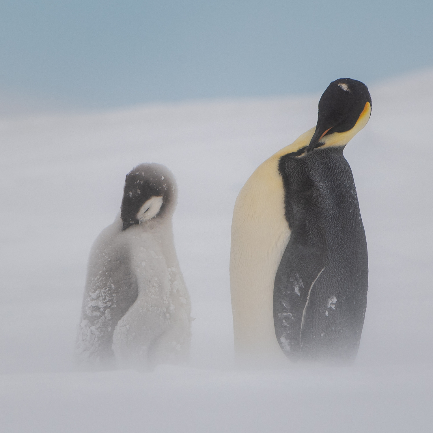 'Like father like son-Emperor penguin with chick in the snow'
